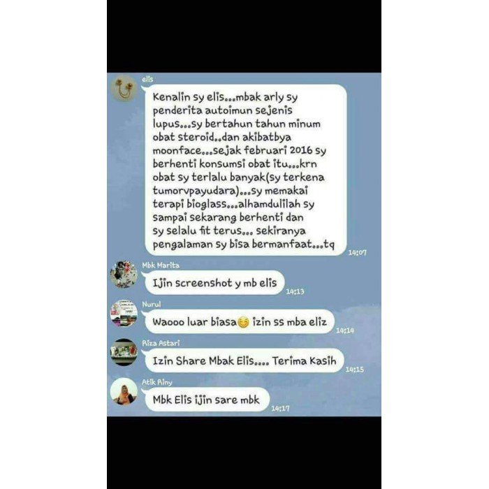 - Rutin minum air bioglass setiap hari 2-3 liter sehari dengan jumlah aliran 20-40 kali